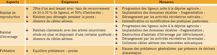 Plusieurs études scientifiques ont démontré les corrélations existantes entre la présence des secteurs aménagés, à savoir les pistes de ski, les sentiers, les remontées mécaniques, ou encore les pistes carrossées et la réduction des populations de Tétras lyre à proximité.